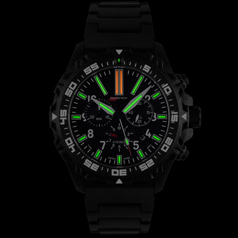 In addition to Swiss Tritium Tubes, Armourlite selected the Swiss Made Ronda 5040.D chronograph movement to assure both the precision accuracy and durability of your stopwatch. Whether you are an aircraft or vessel pilot, auto racer, diver, police officer, EMT professional or just an everyday sports enthusiast, this timepiece will assure you are properly equipped.