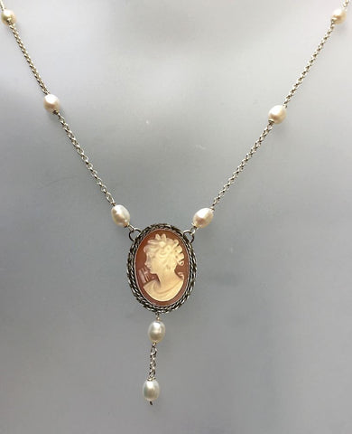 Hand Carved Cameo Necklace Accented by Freshwater Pearls