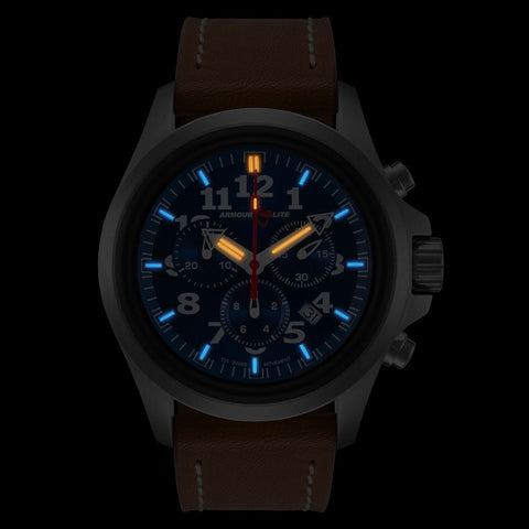 ArmourLite AL834 - Stainless Steel Tritium Chronograph, Shatterproof Armourglass, 100M WR, Blue Dial, Brown Leather Strap