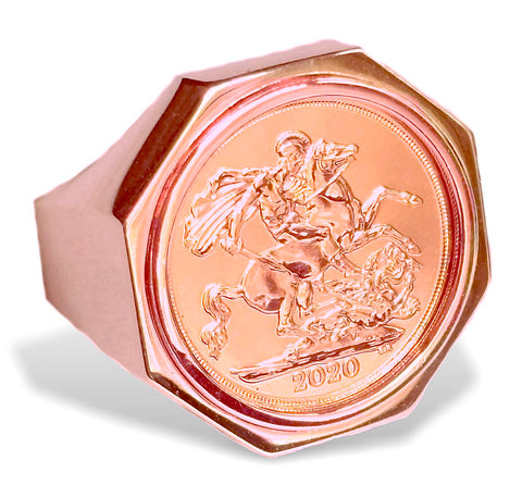 Gem of the Day has designed a special ring just to hold these coins, our royal octagonal 14k Rose Gold Ring. Large, heavy and beautiful, our ring with the British Sovereign is a ring that will be cherished for generations.