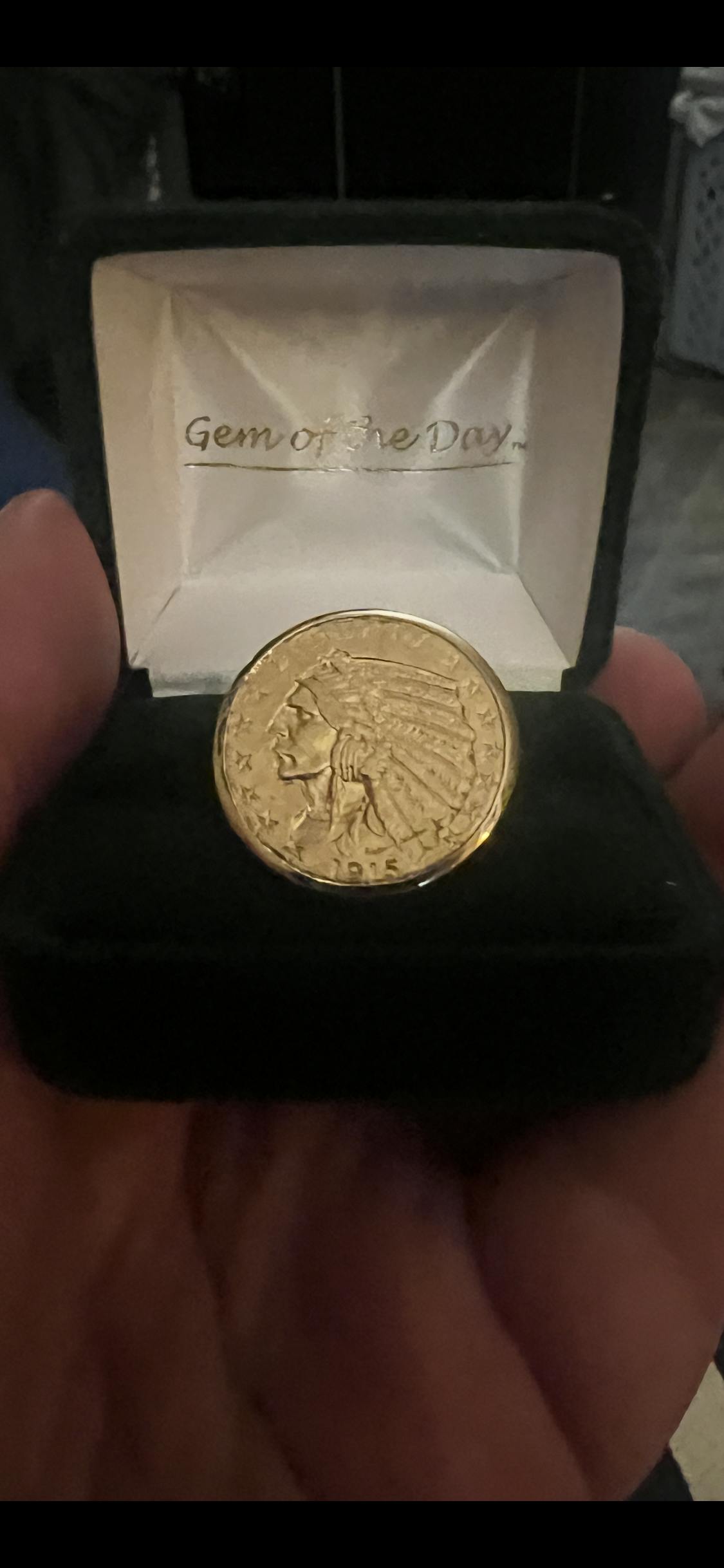 The coin itself is a Big Coin, measuring 21.6 millimeters, almost one inch across. The ring will be 24 millimeters, about 1 inch. And the Indian Head coin is quite rare and very valuable. It is 90% pure gold and weighs 1/4 ounce.