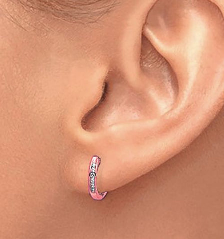 Small 10k Rose Gold Hoops for pierced ears with 1/8th carat of diamonds (total weight). Locking pierced ear posts for safety and security.