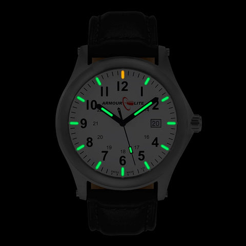 The HUGE ADVANTAGE the Armourlite Watch has over other RAILROAD WATCHES is that it contains Super Bright GLOWING Swiss Tritium Markers on the Dial. This means it is as easy to read at night as it is in the daytime. The Glowing Dial Markers are Self Powered and never fade out during the night; in fact, the Tritium Tubes will glow continuously for up to 25 straight years.