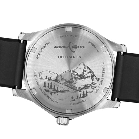 The New ArmourLite Field Series of Tritium Illuminated Watches is entirely SWISS MADE and features the shatterproof Armourglass crystal. Naturally, it utilizes Swiss Tritium Illumination, a fine Swiss Ronda Quartz Movement, and a solid stainless steel case. Model AL133 has a reflective blue dial with tan Arabic numerals and is crisp and easy-to-read under any conditions with an all stainless steel bracelet.