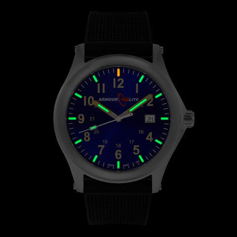 ArmourLite AL133 - Stainless Steel Tritium Field Watch, Shatterproof Armourglass, 100M WR, Blue Dial, Black PU Dive Strap
