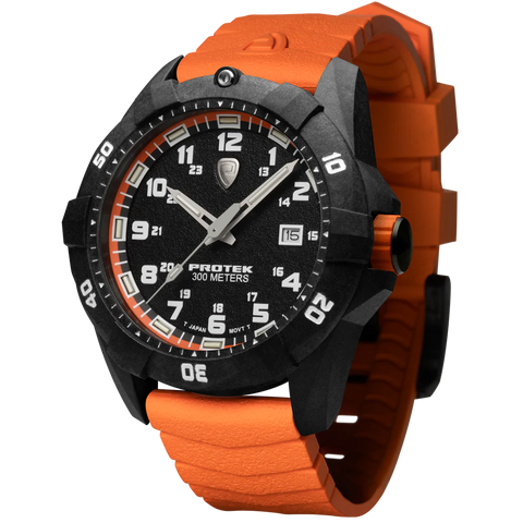 Protek PT1004O – Carbon Dive 1000 Series, Black & Orange Military Dive Watch with Orange Strap