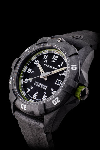 The Protek Carbon Dive 1010 Series, officially designated as a U.S. Marine Corps watch, is built to thrive in the harshest conditions. With a carbon composite case, sapphire crystal, and 300-meter water resistance, it delivers the uncompromising durability and reliability required by Marines in the field. ProGlo™ Swiss tritium illumination ensures visibility around the clock, for 25 years straight.