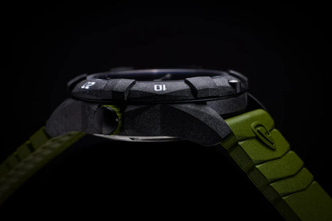 - Screw-down Crown with Double O-ring Water Resistance and Green Rubber Grip