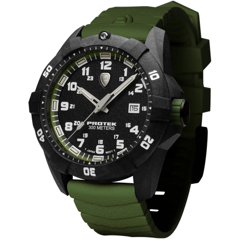 Protek PT1005G – Carbon Dive 1000 Series, Black & Green Military Dive Watch with Green Strap