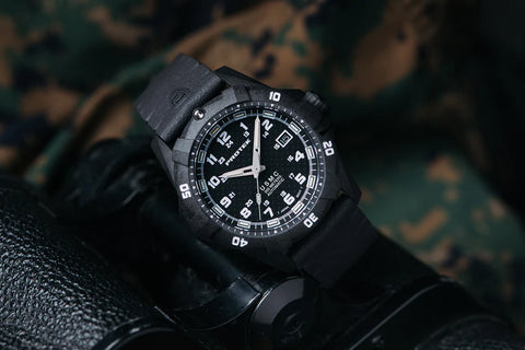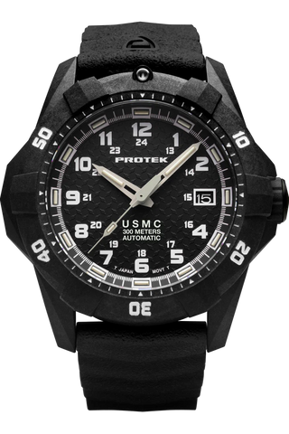 The ProTek Carbon Dive 1210 Series is the automatic evolution of the Official USMC Dive Watch. Retaining the rugged durability, ProGlo™ Swiss tritium illumination, and 300-meter water resistance of the 1010 quartz line, the 1210 Series upgrades to a self-winding automatic movement for those who prefer mechanical precision and craftsmanship.