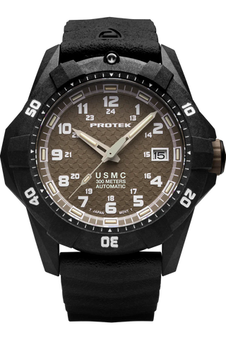 The ProTek Carbon Dive 1210 Series is the automatic evolution of the Official USMC Dive Watch. Combining the rugged durability, 300-meter water resistance, and ProGlo™ Swiss tritium illumination of the 1010 quartz line with a self-winding mechanical movement, the 1210 Series delivers both field-ready performance and watchmaking craftsmanship.