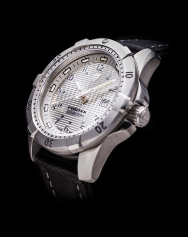 Protek PT2004 – Stainless Steel Dive Watch, 200M WR, Steel Dial with Tritium Illumination, Leather Strap