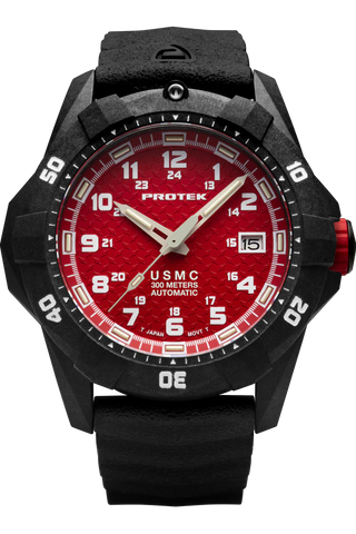 Protek PT1212 USMC Automatic – US Marine Corps Dive Watch, 300M WR, Black & Red with Tritium Illumination, Rubber Strap