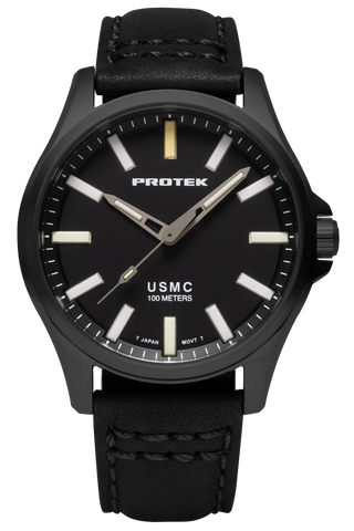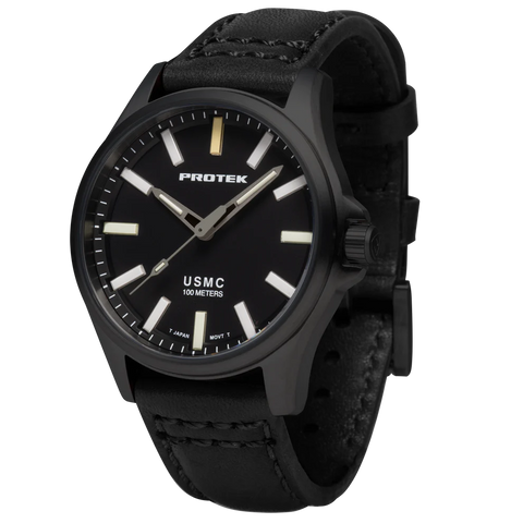 Protek PT3102 – Black Titanium USMC Field Watch, 100M WR, Black Dial with Tritium T100 Illumination, Black Leather Strap