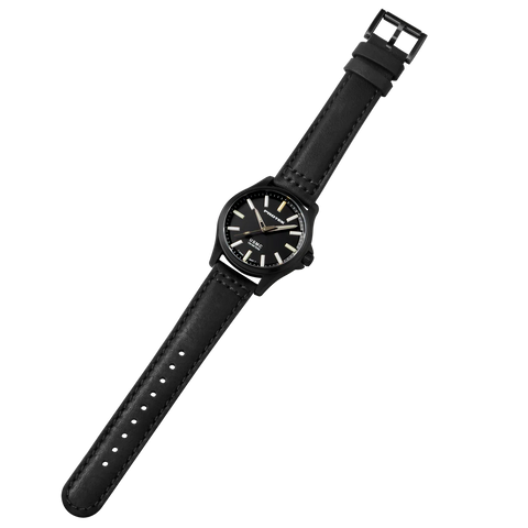 This variant features a crisp black dial paired with a black waterproof Italian leather strap. Its design balances purposeful simplicity with military aesthetic, the black tone gives it stealth and versatility, whether in duty gear or casual wear.