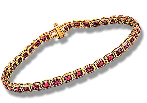 We use over 4 1/2 carats of beautiful rubies, each stone Emerald Cut, carefully matched and a vibrant red. The Rubies are Laboratory Grown to insure the quality, clarity and color you deserve. Mined Rubies cannot match this clarity without spending thousands of dollars more. Trust the science. The artistry of Lab Grown Rubies cannot be matched. Each stone is cut by a master gemologist and match with careful perfection. The result is a bracelet you will treasure for a lifetime.