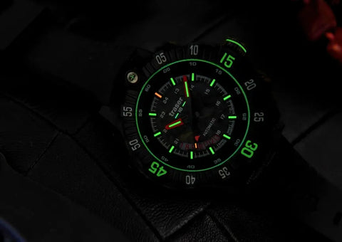 - Super-Luminova on the Bezel at the 15 minute, 30 minute and 45 minute Markers