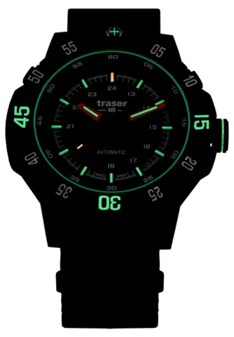 The traser P99 A Tactical embodies Swiss watchmaking at its most robust. With its carbon-reinforced polymer case and textured carbon dial, it offers exceptional durability for the most demanding missions. The reliable Swiss automatic movement ensures precise timekeeping without an external power source, while the elegant see-through caseback provides a captivating glimpse into the heart of this tactical timepiece.